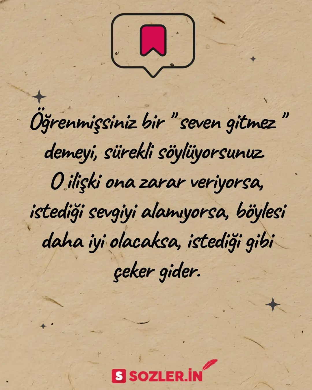 Öğrenmişsiniz bir ” seven gitmez ” demeyi, sürekli söylüyorsunuz. O ilişki ona zarar veriyorsa, istediği sevgiyi alamıyorsa, böylesi daha iyi olacaksa, istediği gibi çeker gider.